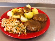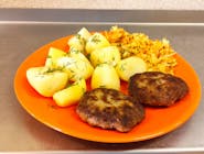 Rumsztyk z cebulką 2 szt., ziemniaki z koperkiem, ogórki kiszone